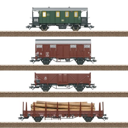 Ein vierteiliger Nebenbahn-Güterzug mit einem Gepäckwagen der Lokalbahnen als Begleitwagen und drei unterschiedlichen Güterwagen mit Beladung.